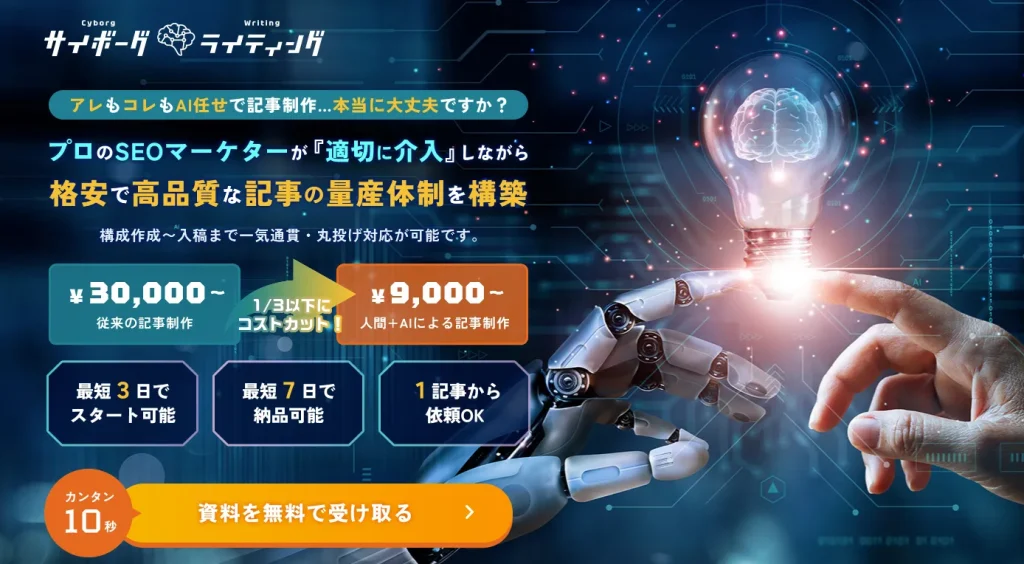 「サイボーグライティング」は、AIの高速生成にプロ編集者の目を加え、品質とスピードを両立させる記事制作サービスです。構成作成から執筆・校正・公開後の改善まですべてをサポートします。