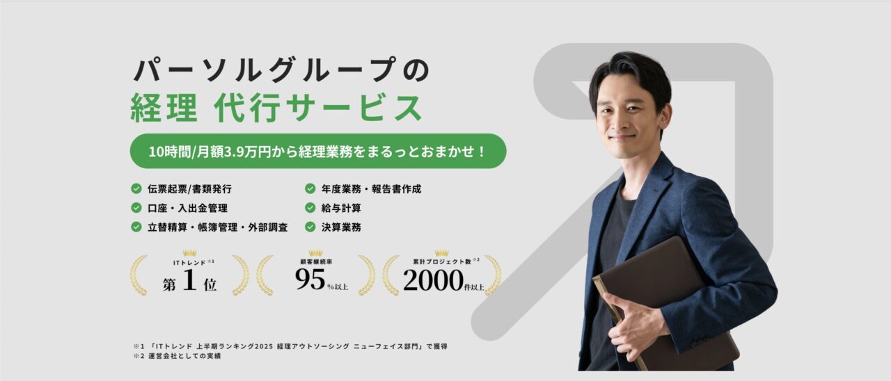 | 特徴 | ・パーソルグループの長年の実績を活かした業務代行を月3.9万円から活用 ・マニュアルは不要!事前準備なしで業務依頼が可能 ・累計プロジェクト数 2,000件以上(運営会社としての実績) | ・自動化サービスが多い ・業務効率化に必須なサービスが満載 | ・経理業務を一括で任せられる ・電子帳簿保存法とインボイス制度に対応 | ・遠隔でも正確かつスムーズに作業を代行 ・経理の属人化を防いでくれる | ・税理士法人が母体なので安心 ・有資格者30名以上が在籍 | ・経理業務をすべて外注できる ・リアルタイムでの見える化で安心 | ・AIとクラウド技術を活用しているので使いやすい ・経験豊富な公認会計士監修 | ・専門知識を持つスタッフによる高品質サポートあり ・料金プランが豊富なので選びやすい | ・リアルタイムで経理状況を把握できる ・専門家によるサポートがあるので安心 | ・リーズナブルな価格形態 ・高品質・安定稼働のチーム体制で安心して任せられる | ・3日で専門チーム立上げが可能 ・会社規模に合ったサポートを実施 |