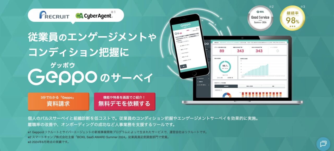 3,500社以上が導入する国内有数のエンゲージメントサーベイツールです。慶應義塾大学の島津明人教授監修のもと開発され、3分で回答できるパルスサーベイで組織状態を継続的に測定できます。