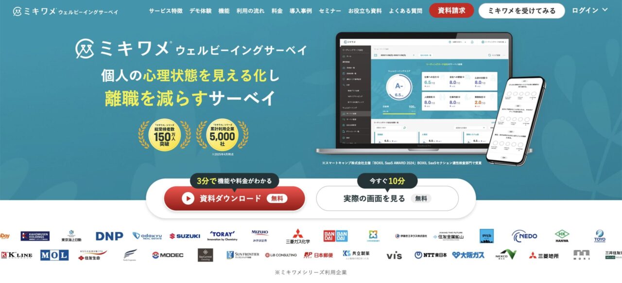 | 主な特徴 | 3分回答、1億件超のデータ分析 | 476万人のデータベース、多角分析 | ウェルビーイング支援、セルフケア機能 | 24問で要因分析、研修連携 | 無料診断、匿名制診断 |