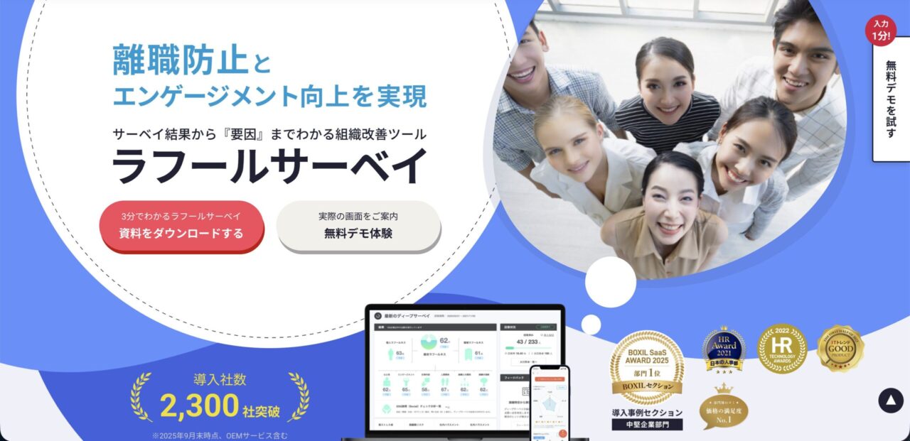 ラフールサーベイは、組織と個人の課題を可視化し、ウェルビーイング経営の実現を支援するツールです。