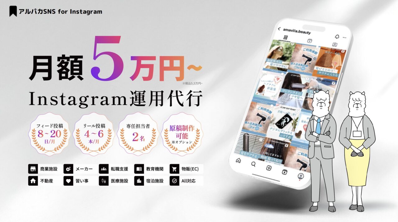 高品質なビジュアル制作が強みのアルパカSNSは、様々な課題に対応可能な豊富なプランがあり、依頼のしやすさで人気のインスタ運用代行サービスです。