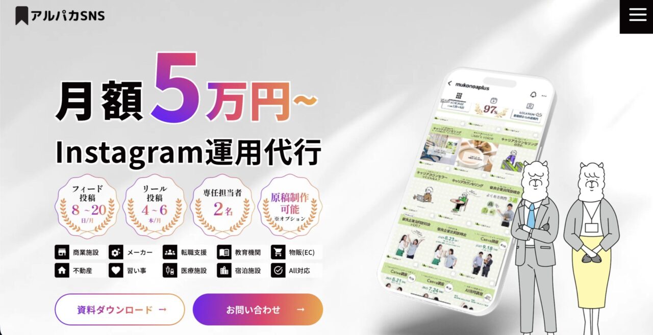 高品質なビジュアル制作が強みのアルパカSNSは、月額5万円、月8投稿から始められる依頼のしやすさで人気のインスタ運用代行サービスです。