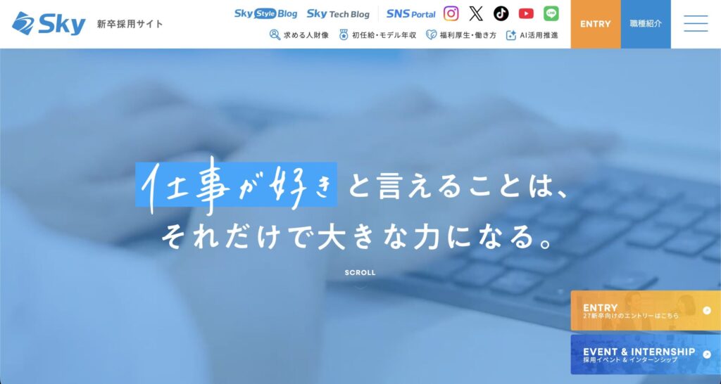 Sky株式会社は、業務系システムやICTソリューションの開発を行うソフトウェア企業です。採用サイトではSNSとの連携を積極的に推進し、多様な接点を創出しています。